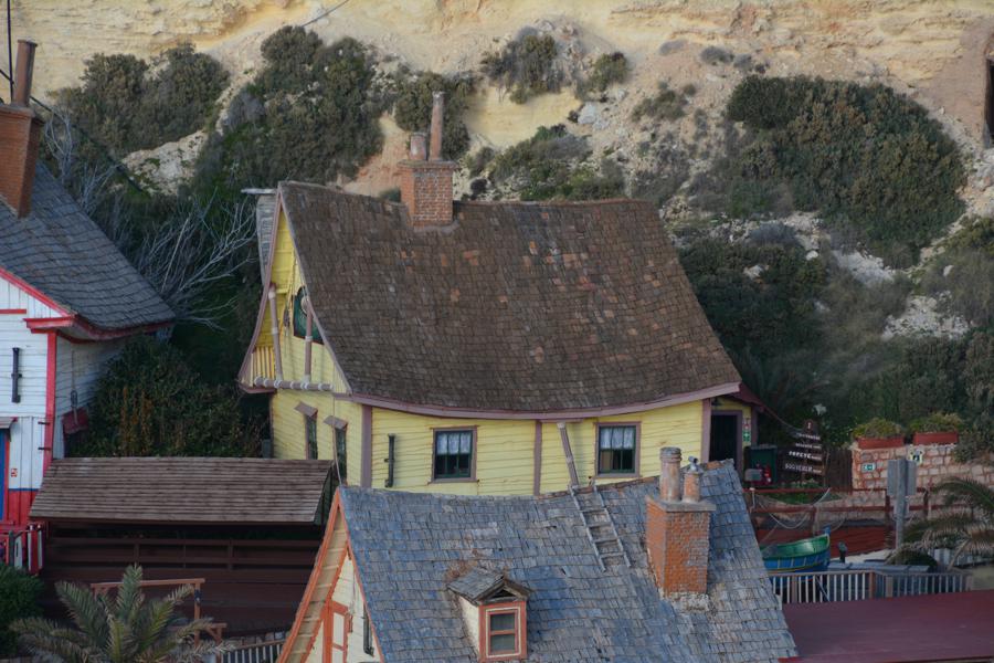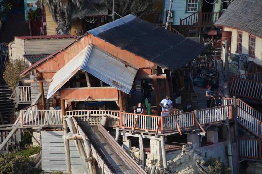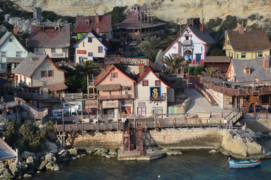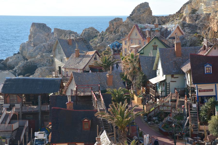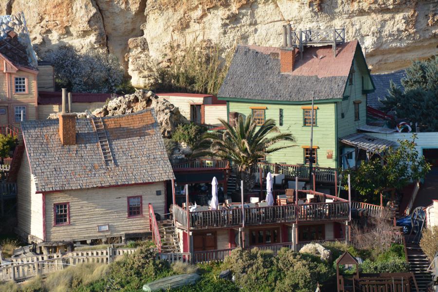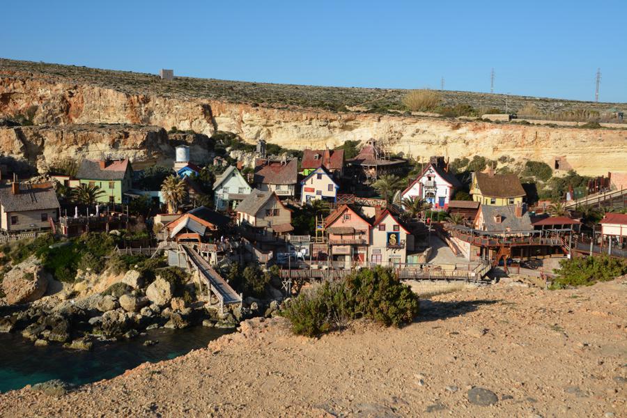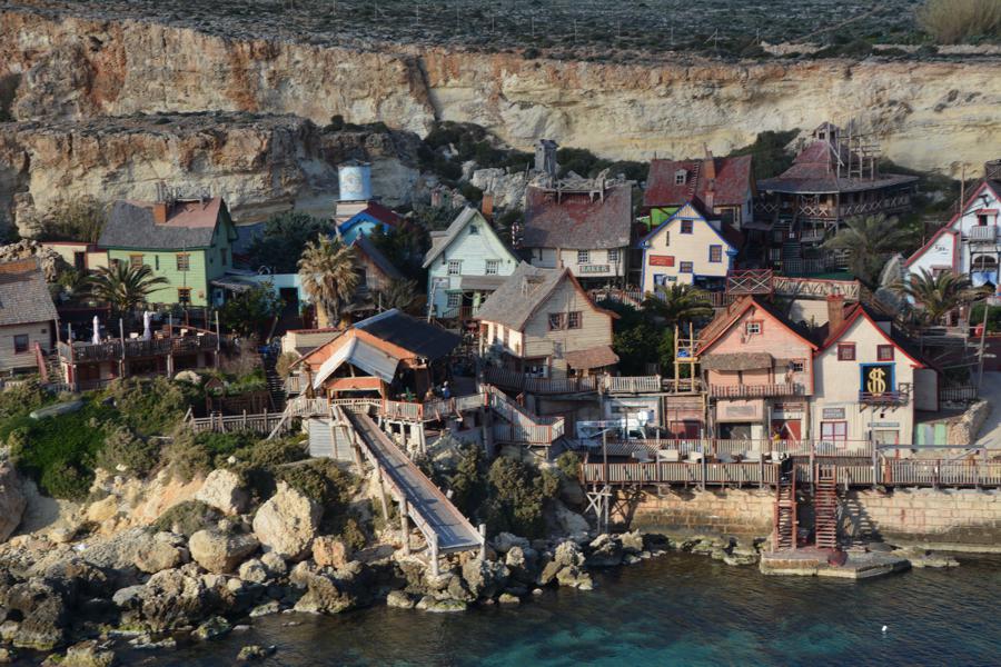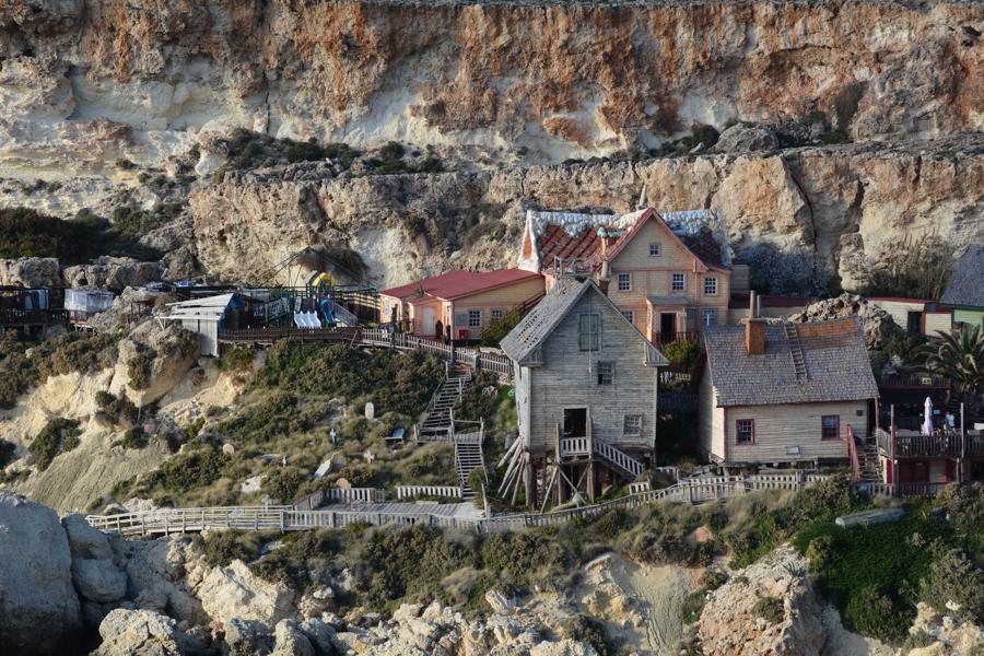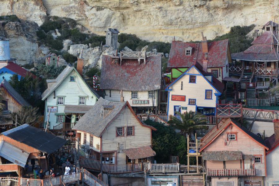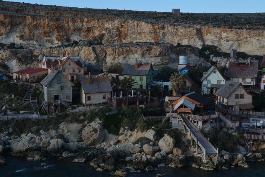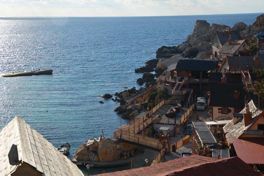 Zufällig stossen wir auf „Popeye Village“, eine der Touristenattraktionen auf Malta. Es handelt sich um eine lebensgrosse, begehbare Filmkulisse für einen alten Popeye-Film.