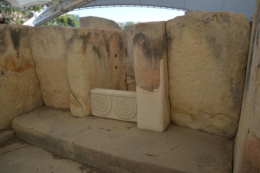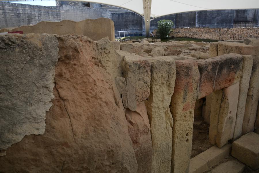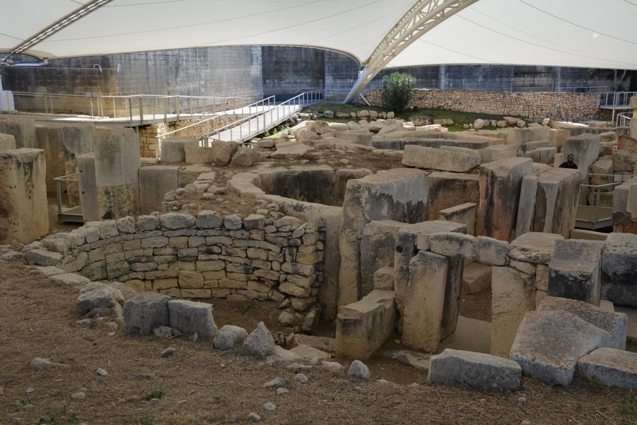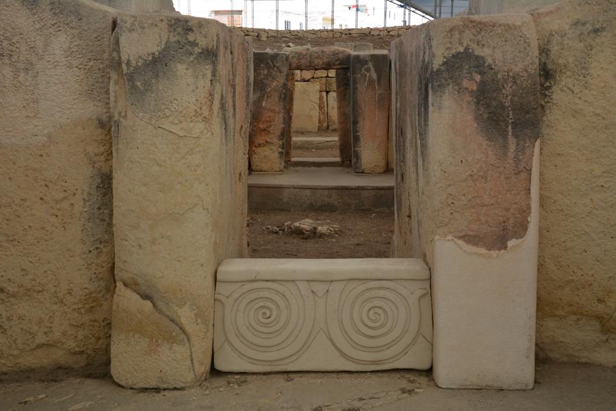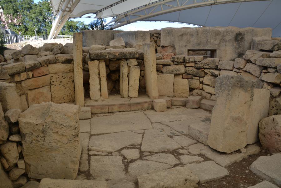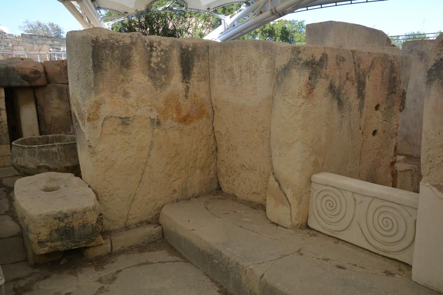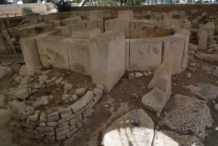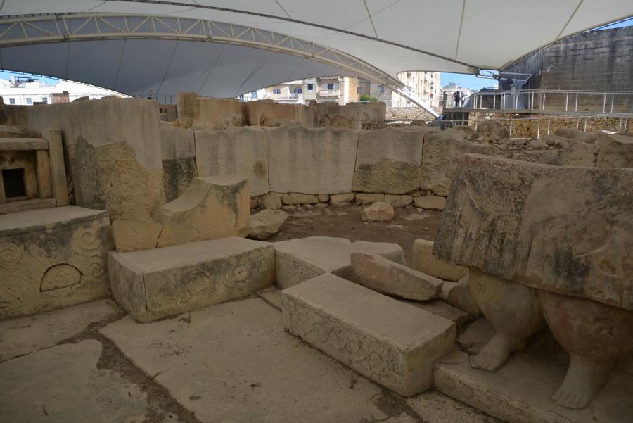 Die Steinzeit-Tempelanlage von Tarxien (3300 bis 2500 v.Chr.) besteht aus vier verschiedenen Tempeln, die innerhalb eines Jahrtausends errichtet wurden. Vom ältesten der Tempel ist nur noch wenig zu sehen, die neueren Tempel sind sehr gut erhalten. Die monumentale Statue, von der nur noch die untere Hälfte erhalten geblieben ist, lässt ahnen, wie hoch die Anlage einst gewesen sein muss.